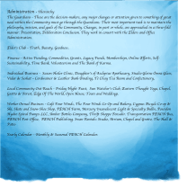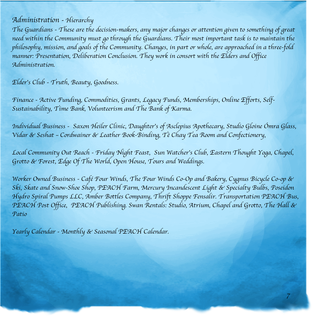 The Guardians – These are the decision-makers, any major changes or attention given to something of great need within the Community must go through the Guardians. Their most important task is to maintain the philosophy, mission, and goals of the Community. Changes, in part or whole, are approached in a three-fold manner: Presentation, Deliberation Conclusion. They work in consort with the Elders and Office Administration.