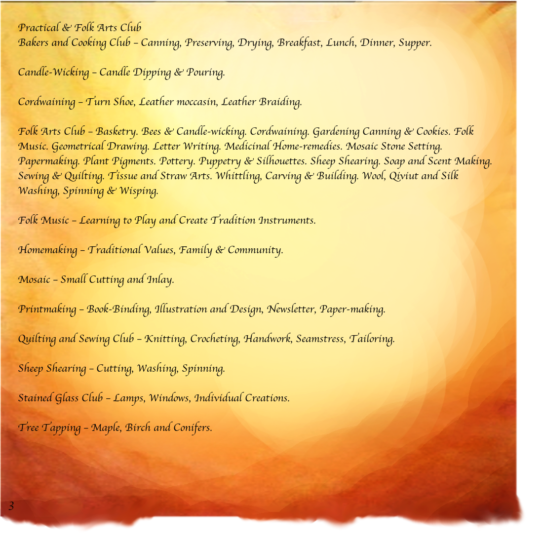 Folk Arts Club – Basketry. Bees & Candle-wicking. Cordwaining. Gardening Canning & Cookies. Folk Music. Geometrical Drawing. Letter Writing. Medicinal Home-remedies. Mosaic Stone Setting. Papermaking. Plant Pigments. Pottery. Puppetry & Silhouettes. Sheep Shearing. Soap and Scent Making. Sewing & Quilting. Tissue and Straw Arts. Whittling, Carving & Building. Wool, Qiviut and Silk Washing, Spinning & Wisping.