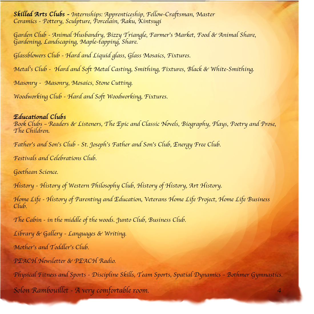 Skilled Arts Clubs: Ceramics, Garden, Glassblowers, Metal, Masonry, Woodworking.