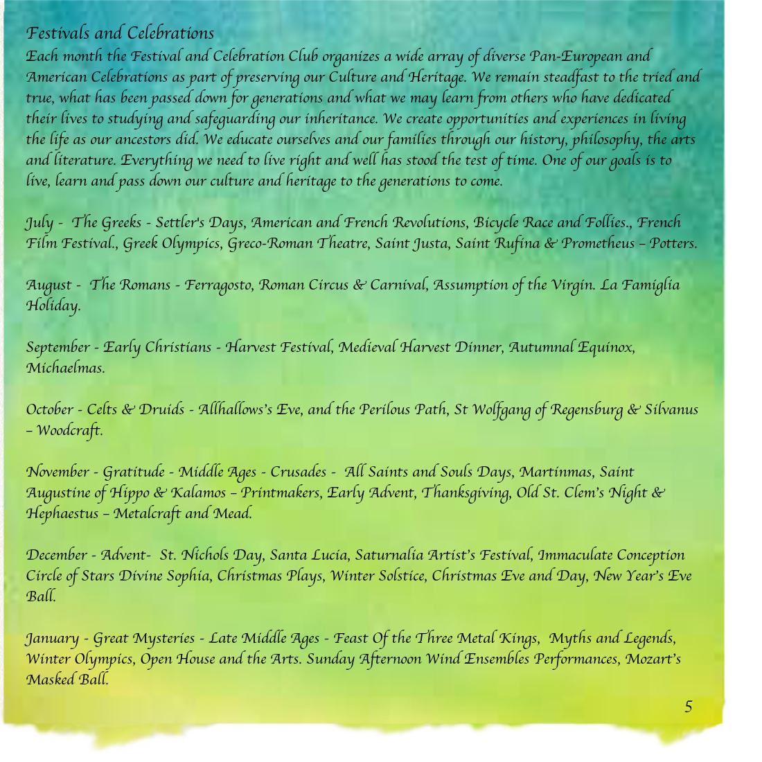 Each month the Festival and Celebration Club organizes a wide array of diverse Pan-European and American Celebrations as part of preserving our Culture and Heritage. We remain steadfast to the tried and true, what has been passed down for generations and what we may learn from others who have dedicated their lives to studying and safeguarding our inheritance. We create opportunities and experiences in living the life as our ancestors did. We educate ourselves and our families through our history, philosophy, the arts and literature. Everything we need to live right and well has stood the test of time. One of our goals is to live, learn and pass down our culture and heritage to the generations to come.