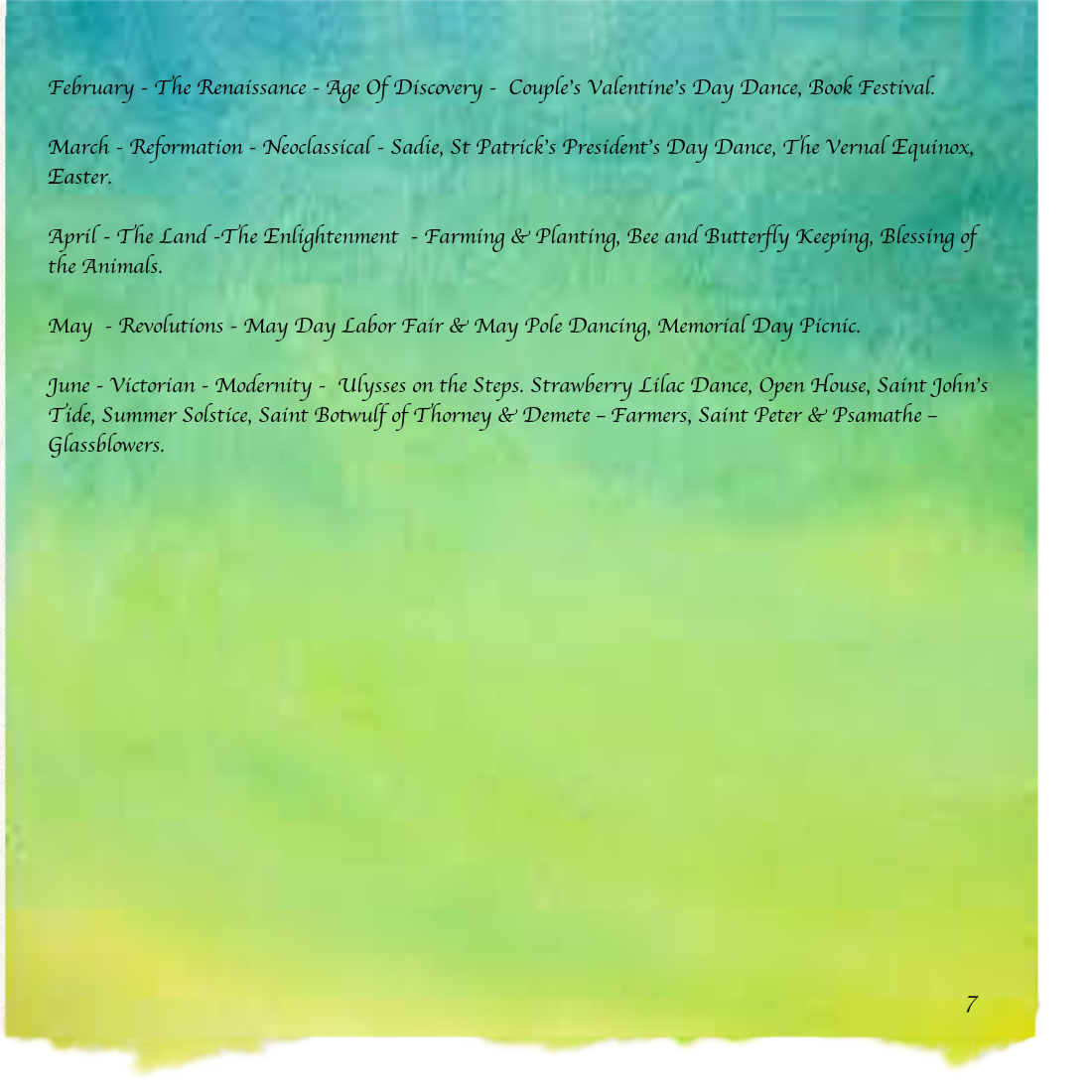 March — Reformation/Absolutism, Sadie St. Patrick & President’s Day Dance, Vernal Equinox, Eostre/Easter, Age of Expansion, Neo-classical.