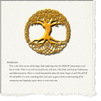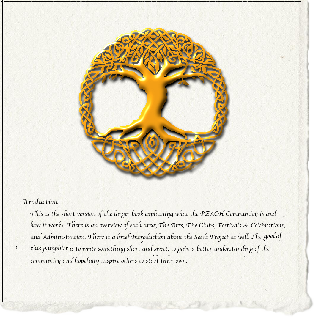 This is the short version of the larger book explaining what the PEACH Community is and how it works. There is an overview of each area of The Arts, The Clubs, Celebrations and Festivals, and Administration. There is a brief Introduction about the Seeds Project as well.