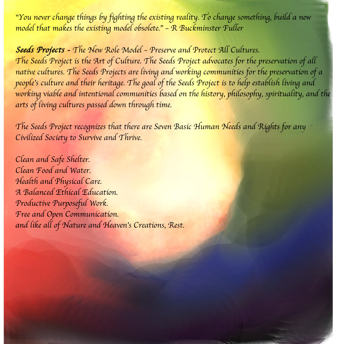 The Seeds Project is the Art of Culture. The Seeds Project advocates for the preservation of all native cultures. The Seeds Projects are living and working communities for the preservation of a people’s culture and their heritage. The goal of the Seeds Project is to help establish living and working viable and intentional communities based on the history, philosophy, spirituality, and the arts of living cultures passed down through time.