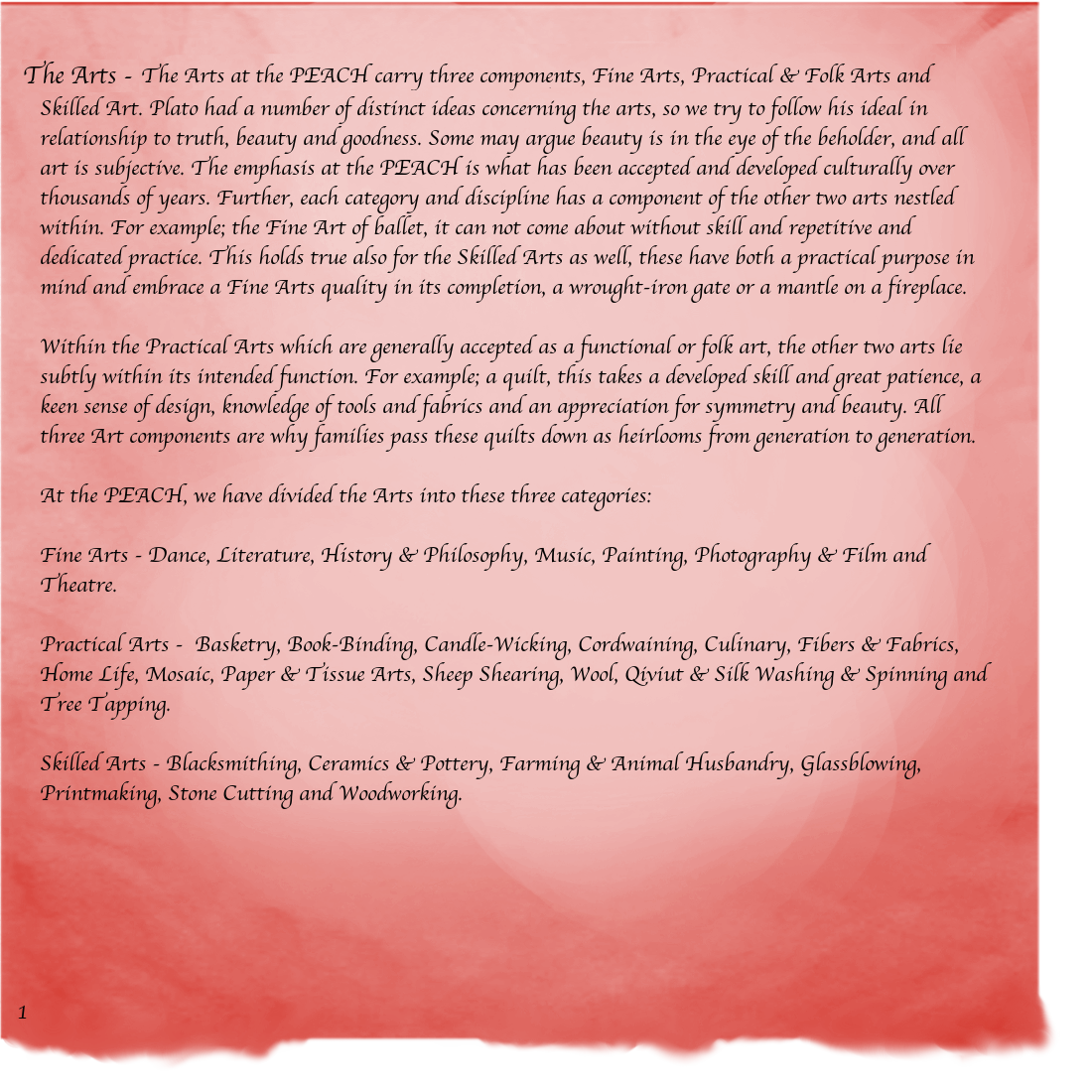 The Arts – The Arts at the PEACH carry three components, Fine Arts, Practical & Folk Arts and Skilled Art. Plato had a number of distinct ideas concerning the arts, so we try to follow his ideal in relationship to truth, beauty and goodness. Some may argue beauty is in the eye of the beholder, and all art is subjective. The emphasis at the PEACH is what has been accepted and developed culturally over thousands of years. Further, each category and discipline has a component of the other two arts nestled within. For example; the Fine Art of ballet, it can not come about without skill and repetitive and dedicated practice. This holds true also for the Skilled Arts as well, these have both a practical purpose in mind and embrace a Fine Arts quality in its completion, a wrought-iron gate or a mantle on a fireplace. Within the Practical Arts which are generally accepted as a functional or folk art, the other two arts lie subtly within its intended function. For example; a quilt, this takes a developed skill and great patience, a keen sense of design, knowledge of tools and fabrics and an appreciation for symmetry and beauty. All three Art components are why families pass these quilts down as heirlooms from generation to generation. At the PEACH, we have divided the Arts into these three categories: