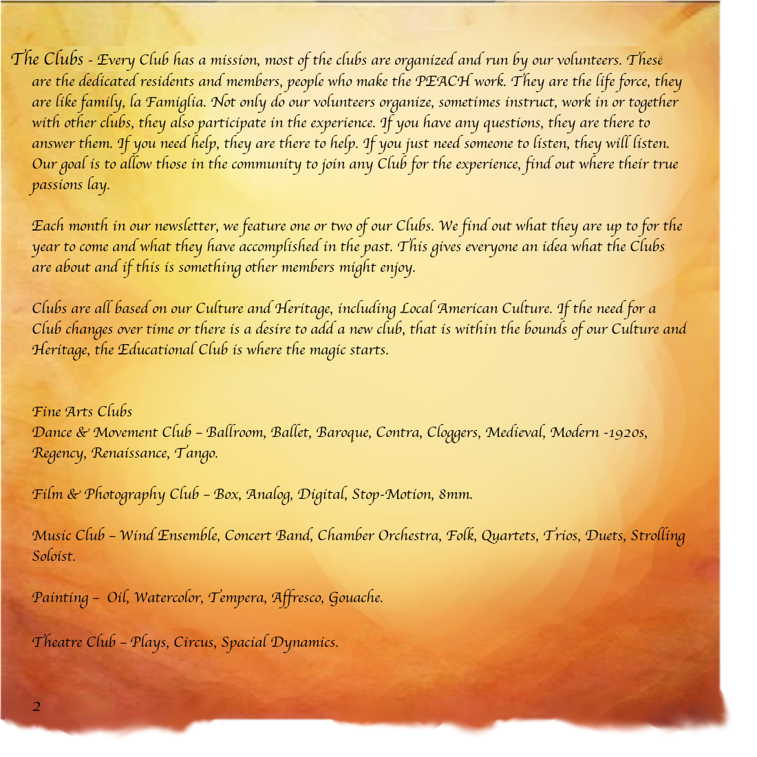 The Clubs – Every Club has a mission, most of the clubs are organized and run by our volunteers. These are the dedicated residents and members, people who make the PEACH work. They are the life force, they are like family, la Famiglia. Not only do our volunteers organize, sometimes instruct, work in or together with other clubs, they also participate in the experience. If you have any questions, they are there to answer them. If you need help, they are there to help. If you just need someone to listen, they will listen. Our goal is to allow those in the community to join any Club for the experience, find out where their true passions lay.